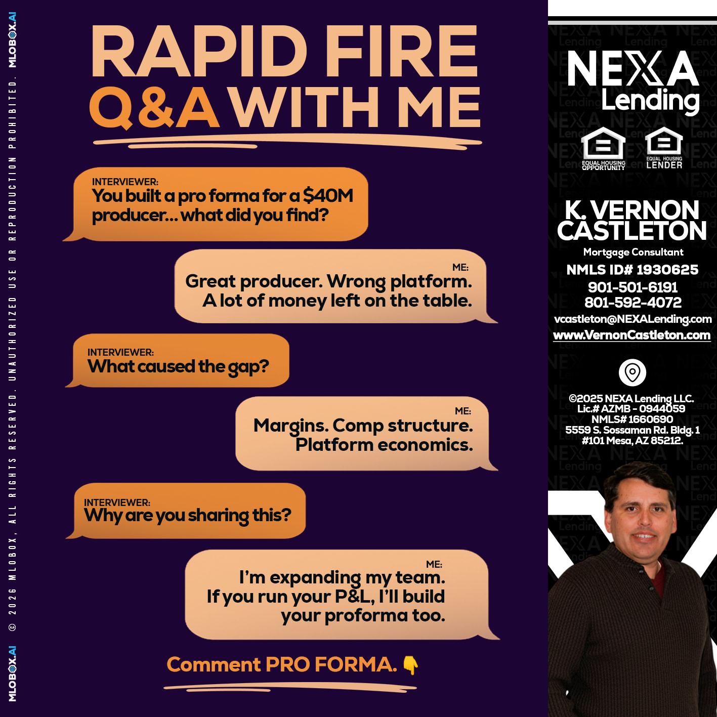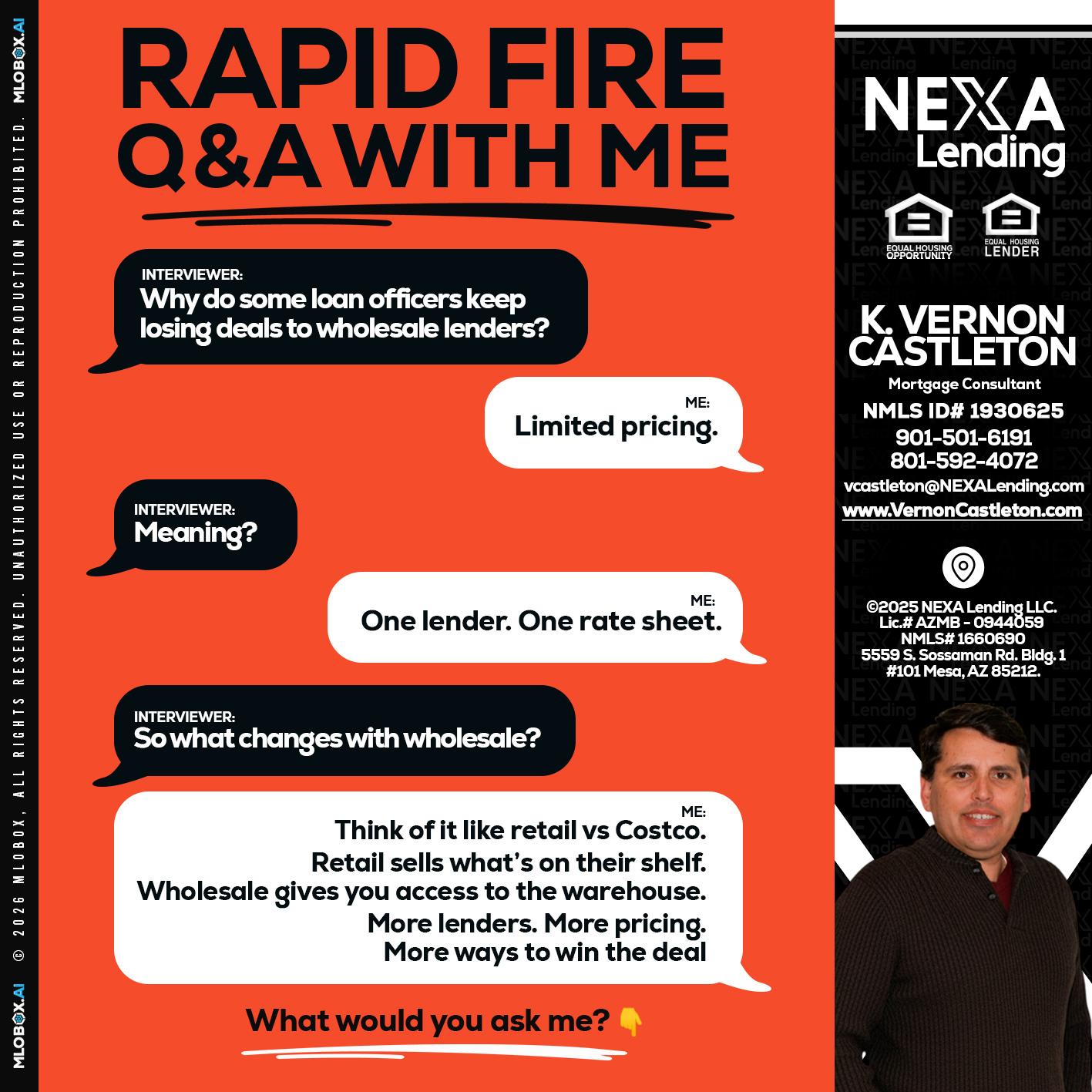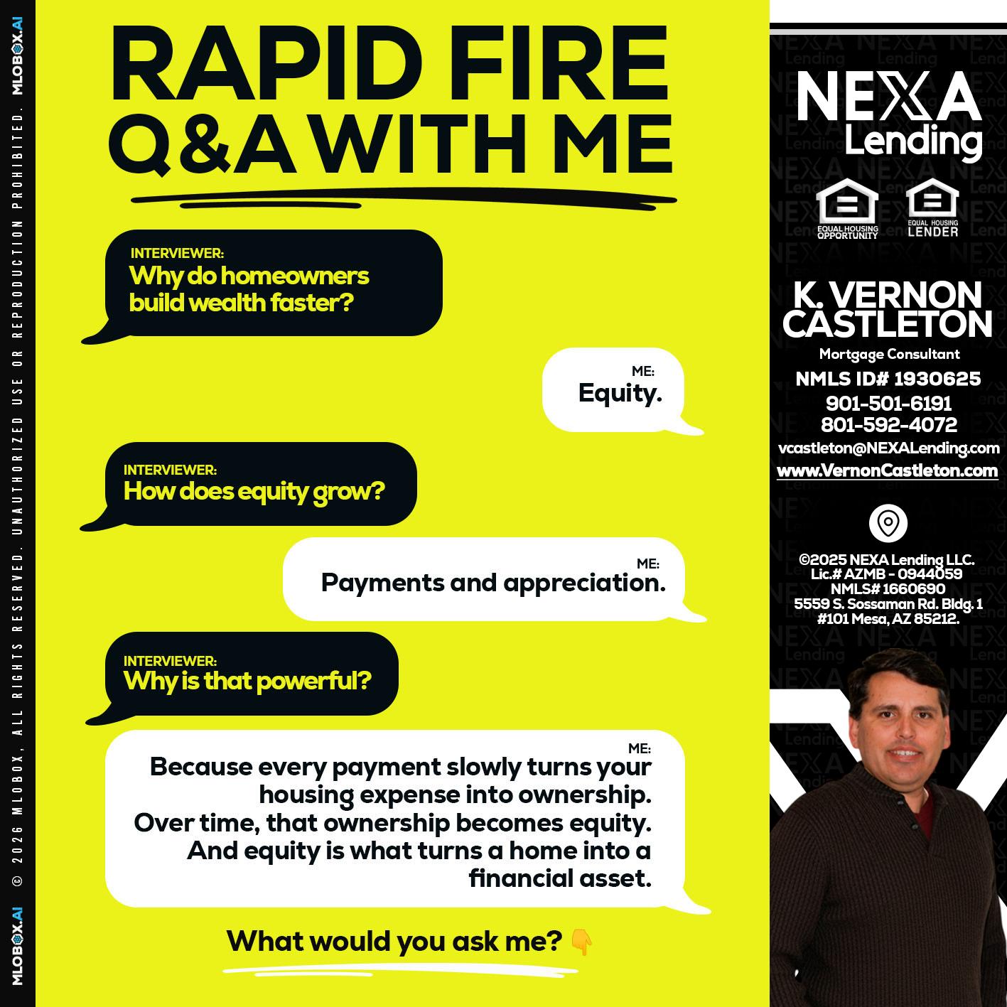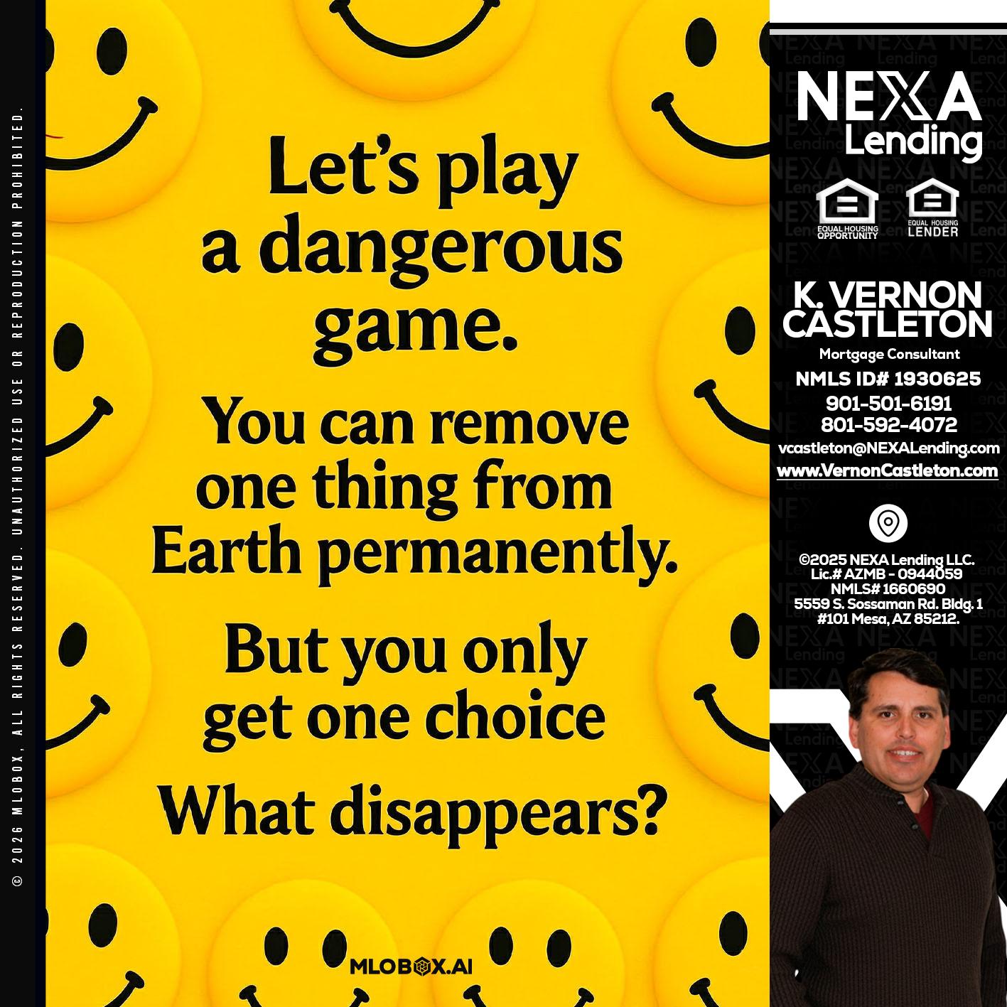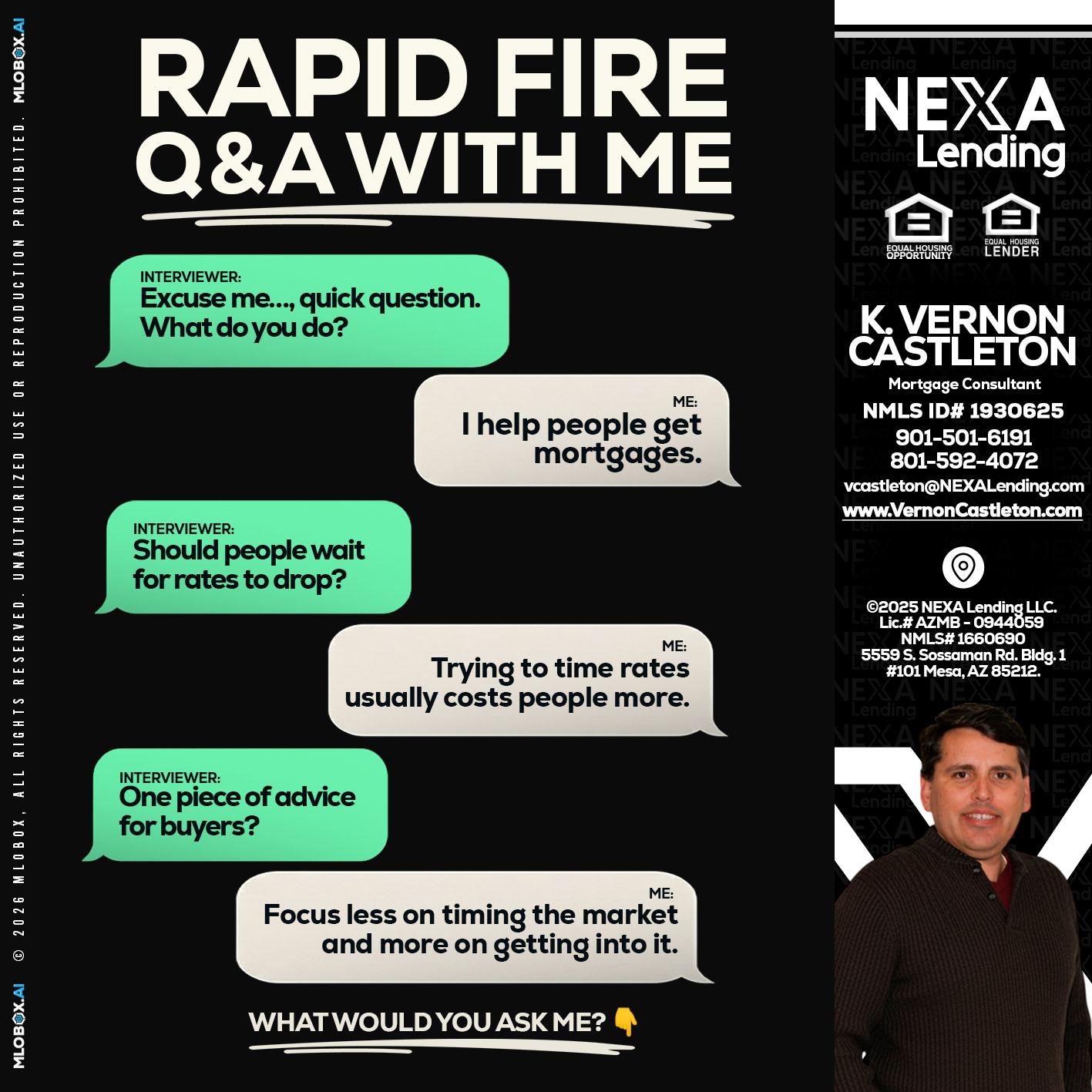 K. Vernon Castleton2026-03-12 22:05:432026-03-12 22:05:431 point forMy job isn’t just to get you a loan for your home at a great rate. I want to teach you how to best position your finances for long term success. Sometimes, that means doing things that seem counter intuitive. Sometimes, it means doing exactly what makes the most common sense. Whatever your options are, I want you to really understand the impact of each possibility, and use that knowledge to help you succeed in your American Dream.