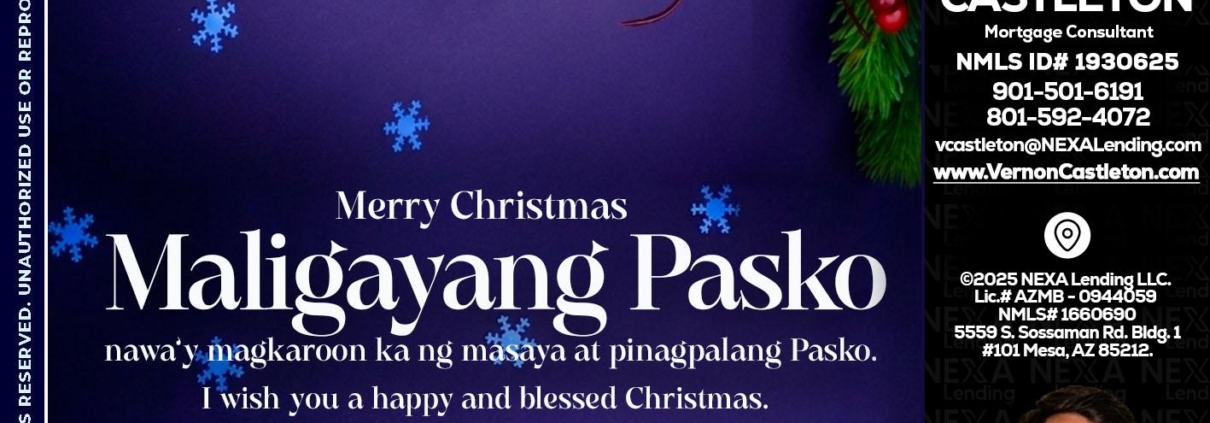 Maligayang Pasko - K. Vernon Castleton -Mortgage ConsultantHi, my name is K. Vernon Castleton. I’m a Loan Officer with NEXA Lending LLC., offering personalized mortgage solutions, fast customized quotes, great rates and service with integrity.
