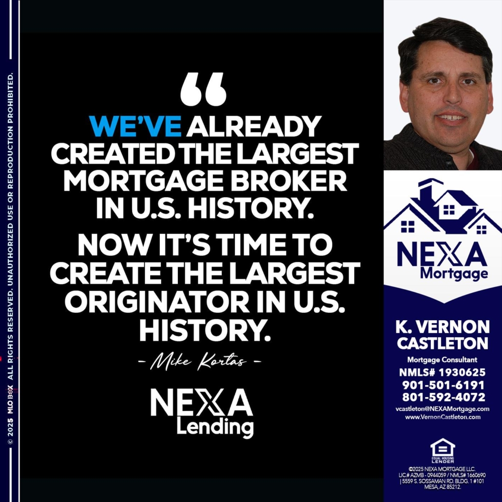 MIKE KORTAS - K. Vernon Castleton -Mortgage ConsultantHi, my name is K. Vernon Castleton. I’m a Loan Officer with NEXA Mortgage LLC., offering personalized mortgage solutions, fast customized quotes, great rates and service with integrity.