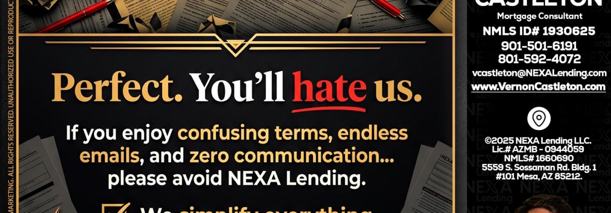 YOU WILL HATE US! - K. Vernon Castleton -Mortgage ConsultantHi, my name is K. Vernon Castleton. I’m a Loan Officer with NEXA Lending LLC., offering personalized mortgage solutions, fast customized quotes, great rates and service with integrity.